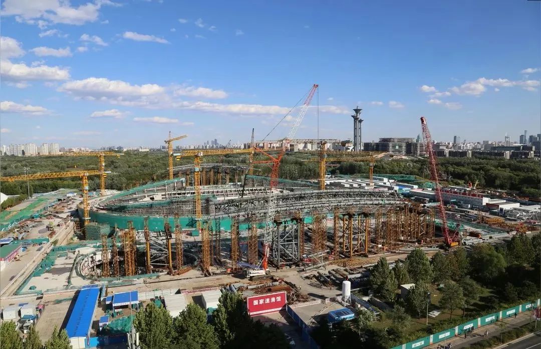 在施工過程中,國家速滑館建設(shè)團隊通過自主技術(shù)創(chuàng)新,采用鋼結(jié)構(gòu)環(huán)桁架“南北分區(qū)直接吊裝+東西兩側(cè)滑移安裝”的施工方法。東西兩側(cè)環(huán)桁架滑移首創(chuàng)國內(nèi)先地面滑移后高空滑移的分段式滑移技術(shù),實現(xiàn)了高效、高精度施工。同時,國家速滑館所采用的看臺板為國內(nèi)首例弧線清水混凝土看臺板,預(yù)制看臺構(gòu)件雖然尺寸多樣、弧度多變,但卻嚴(yán)絲合縫地拼裝成為一個宏大的看臺。僅用8個月,2018年9月30日,主體結(jié)構(gòu)就“拔地而起”,創(chuàng)造出令人驚嘆的“中國速度”。