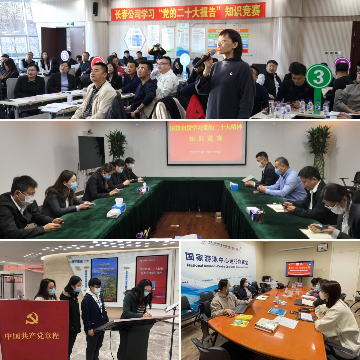 五是聚焦營造氛圍帶動學。公司黨委充分利用公司官網(wǎng)、微信公眾號、OA辦公平臺、國資通APP等宣傳陣地,設計推出“學習宣傳貫徹黨的二十大精神”專題頁面和專欄,及時推送權威學習內(nèi)容,生動展示各級黨組織和廣大黨員學習貫徹黨的二十大精神的情況。北京產(chǎn)權交易所黨委、國家體育場公司黨委等在公司門戶網(wǎng)站、宣傳展示屏、辦公場所宣傳欄等宣傳陣地布置展示學習黨的二十大精神的宣傳內(nèi)容,積極營造“喜慶二十大,奮進新征程”的熱烈氛圍。國家游泳中心公司黨總支充分利用辦公區(qū)黨建展板打造黨的二十大專題學習“微陣地”,圖文并茂地展示了黨的二十大報告等內(nèi)容。集智未來公司黨支部在園區(qū)大廳設置“奮進新征程 建功新時代”主題立體展板,成為園區(qū)企業(yè)支部活動“網(wǎng)紅”打卡點。北京再擔保公司黨總支、國苑公司黨支部等通過黨支部微信群、公司黨建微信公眾號推送黨的二十大精神學習資料,發(fā)布黨組織學習動態(tài),推動黨的二十大精神學習走深走實。