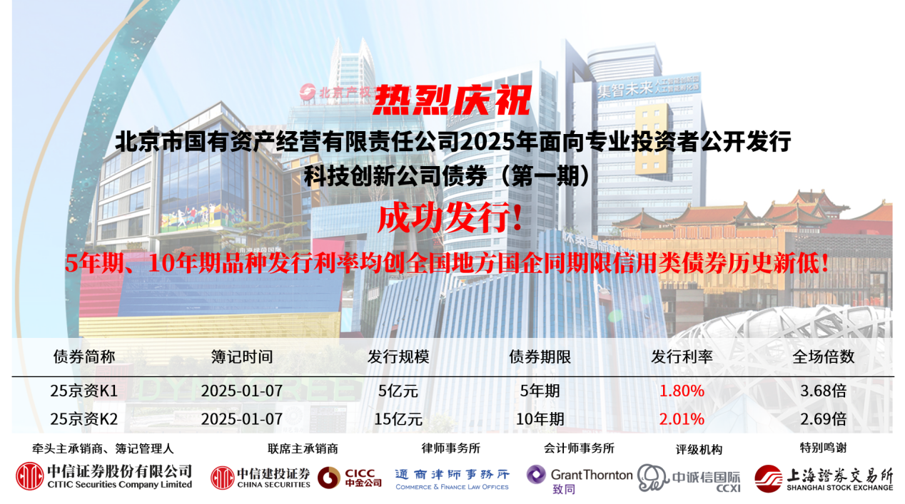 1月7日,北京市國(guó)有資產(chǎn)經(jīng)營(yíng)有限責(zé)任公司(以下簡(jiǎn)稱北京國(guó)資公司)在上交所成功發(fā)行2025年第一期科技創(chuàng)新公司債券,發(fā)行規(guī)模合計(jì)20億元。