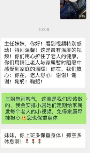 自老年公寓封閉后,公寓的工作人員便與老人家屬們進(jìn)行了一對(duì)一的電話溝通,通過微信,視頻等方式,向家屬們?cè)敿?xì)介紹和展示了當(dāng)前公寓內(nèi)的各種防控措施,以及護(hù)理員照料老人的服務(wù)細(xì)節(jié),以打消家屬們的顧慮,慢慢的一些家屬?gòu)牟慌浜系嚼斫?,最終變成了支持。