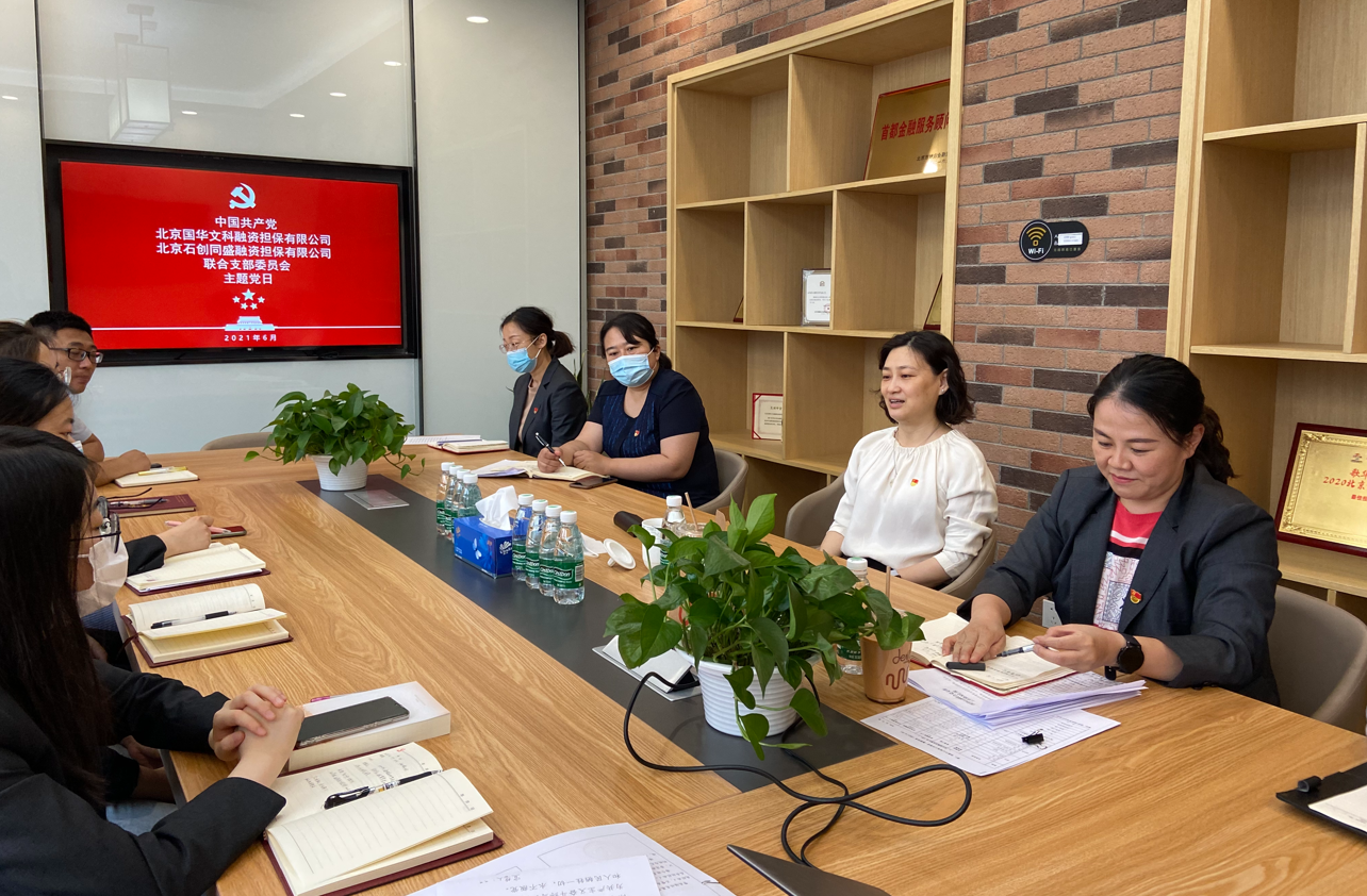 6月24日下午,國資公司副總經(jīng)理孫婧赴黨建基層聯(lián)系點北京再擔保公司所屬國華石創(chuàng)公司聯(lián)合黨支部,參加“重溫百年黨史 汲取青春力量”主題黨日活動。再擔保公司黨總支委員、常務副總經(jīng)理,國華擔保公司總經(jīng)理及國華石創(chuàng)聯(lián)合黨支部全體黨員參加活動。