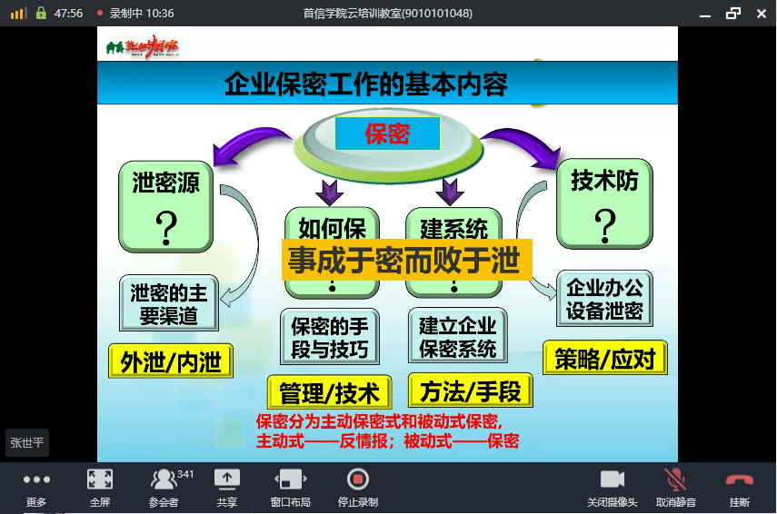 本次培訓(xùn)邀請國內(nèi)知名競爭情報(bào)、反情報(bào)和管理專家,中國競爭情報(bào)實(shí)戰(zhàn)派首要代表,被譽(yù)為中國“商業(yè)007”的張世平教授,圍繞企業(yè)秘密的保護(hù)與保密工作操作方法,重點(diǎn)講解了企業(yè)泄密的主要途徑和竊密的主要手段、商業(yè)泄密的保護(hù)與防范措施。