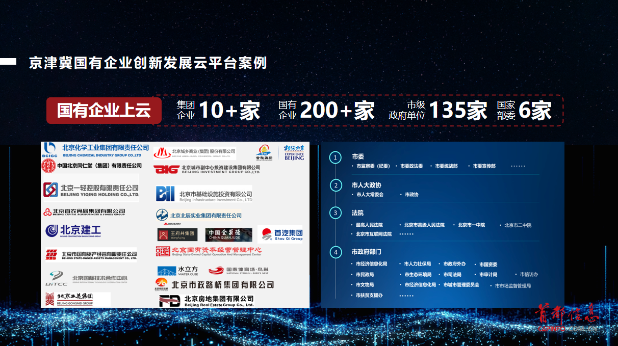 京津冀國(guó)有企業(yè)創(chuàng)新發(fā)展云平臺(tái)案例:首都信息作為市國(guó)資委支持的“京津冀國(guó)有企業(yè)創(chuàng)新發(fā)展云平臺(tái)”云服務(wù)商,積極為市屬國(guó)資國(guó)企提供安全可信云基礎(chǔ)設(shè)施及私有云解決方案,為企業(yè)提供在線管控(“三重一大”決策與運(yùn)行監(jiān)管、大額資金動(dòng)態(tài)管控等)、數(shù)字化運(yùn)營(yíng)(業(yè)財(cái)一體化平臺(tái)等)、協(xié)同服務(wù)(融媒體、營(yíng)銷(xiāo)、移動(dòng)平臺(tái)等)等數(shù)字化平臺(tái)解決方案,取得較好應(yīng)用效果。