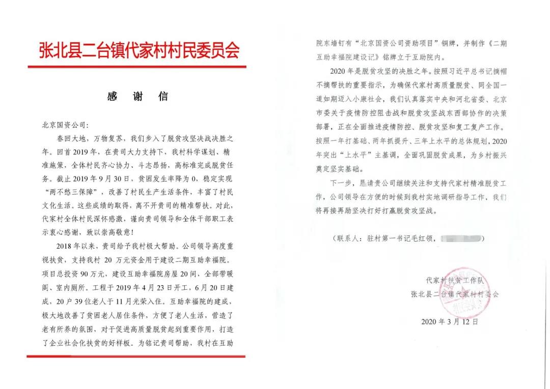 近日,北京國資公司收到一封來自河北省張家口市張北縣二臺鎮(zhèn)代家村扶貧工作隊及村委會發(fā)來的感謝信。這封信簡單而質(zhì)樸,字里行間表達(dá)了對北京國資公司的由衷感謝。
